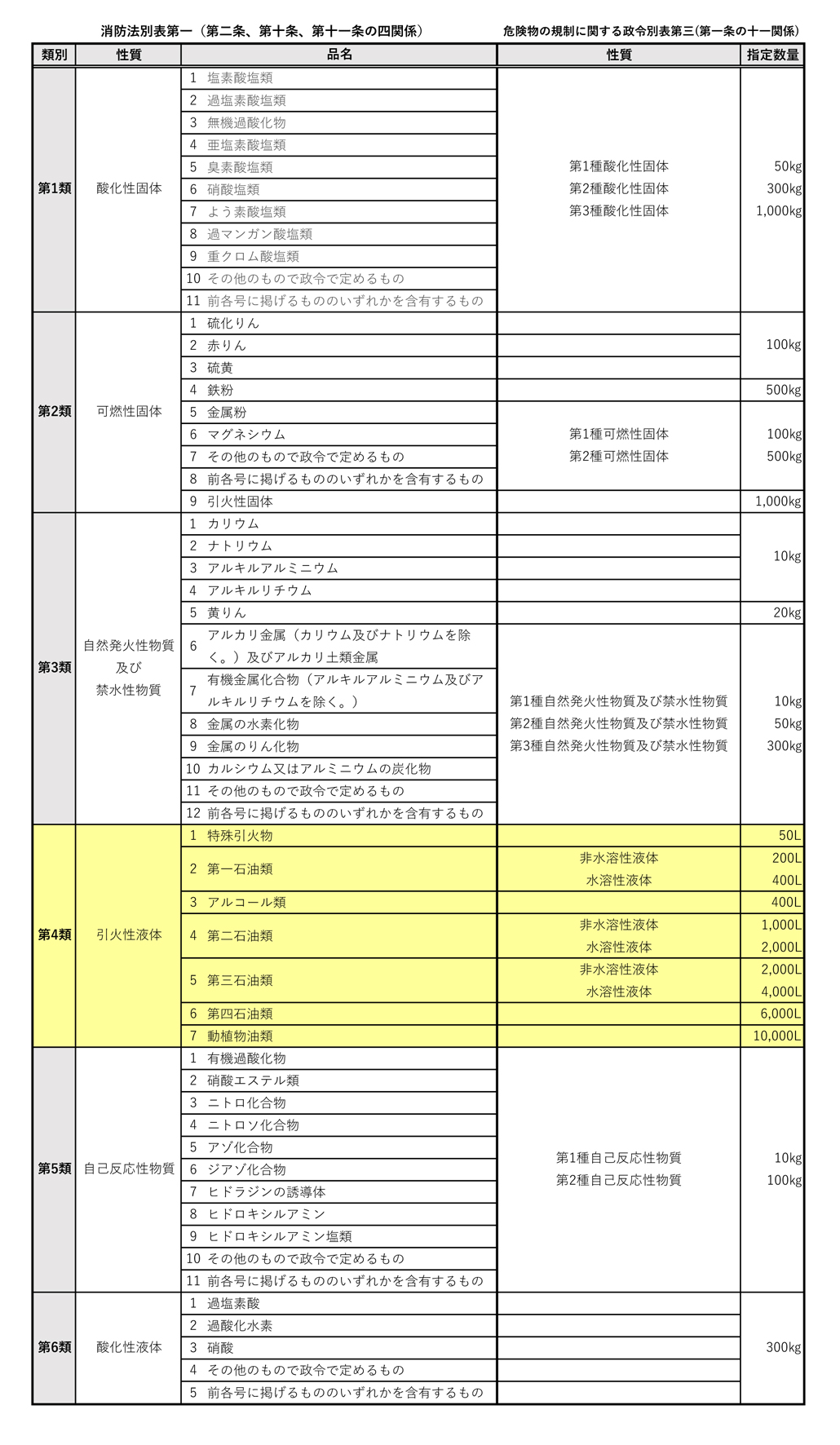 とりあえず「危険物」は消防法に定義されているってこの前調べた。その中に「第4類」っていう分類があることも調べた。→【第四類第二石油類って何?】灯油ポリタンクの文字読んでみた