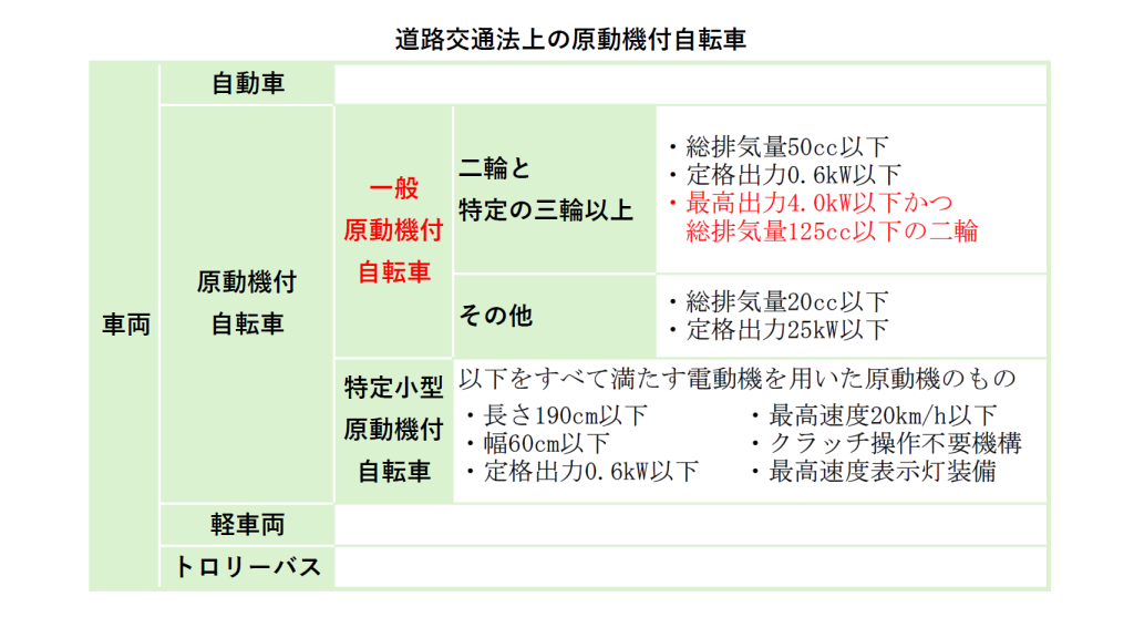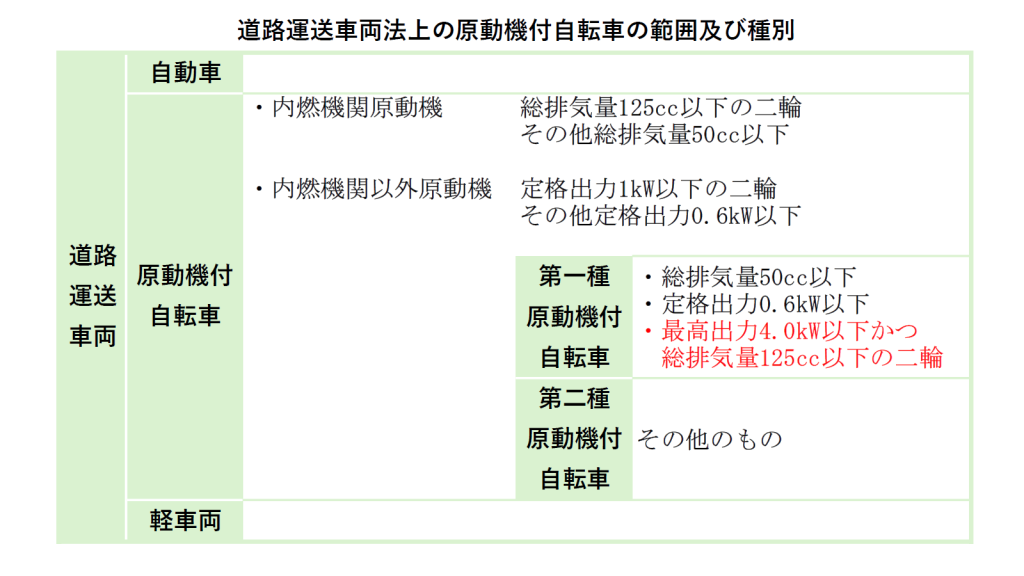 道路運送車両法上の「道路運送車両」は「自動車」「原動機付自転車」「軽車両」に分けられ、原動機付自転車は更に「第一種原動機付自転車」「第二種原動機付自転車」に分けられる。