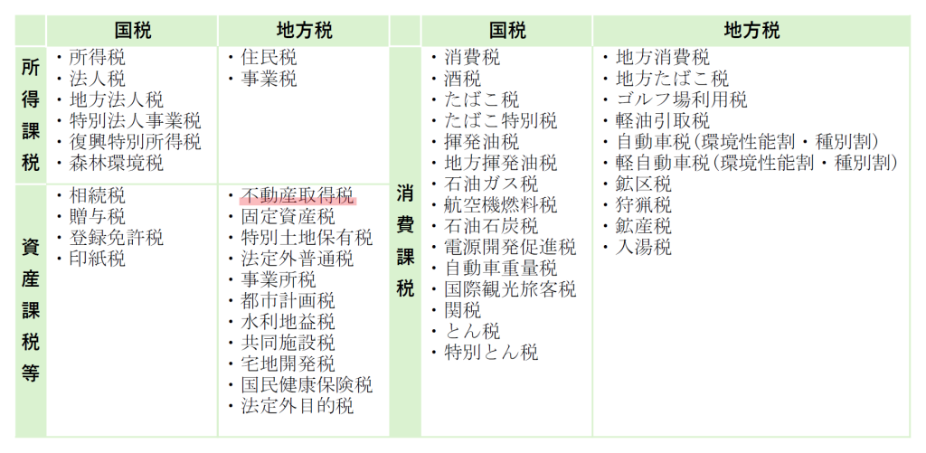 上表のとおり国税が25種類、地方税が23種類の税金があるらしい。(税の種類に関する資料)