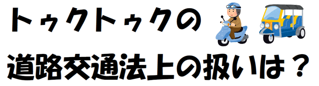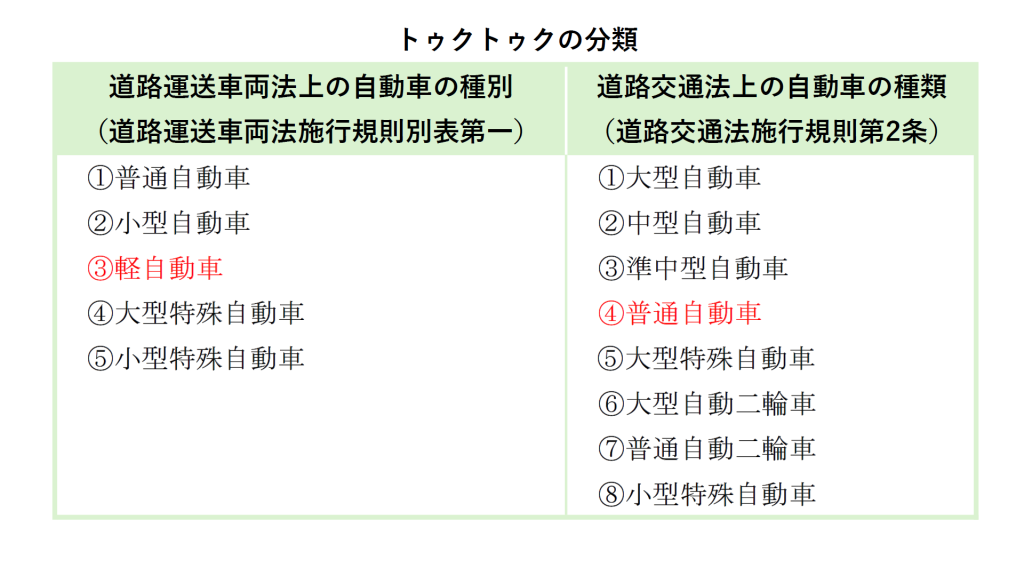 整理すると、トゥクトゥクは道路運送車両法上「軽自動車」、道路交通法上「普通自動車」に分類される。