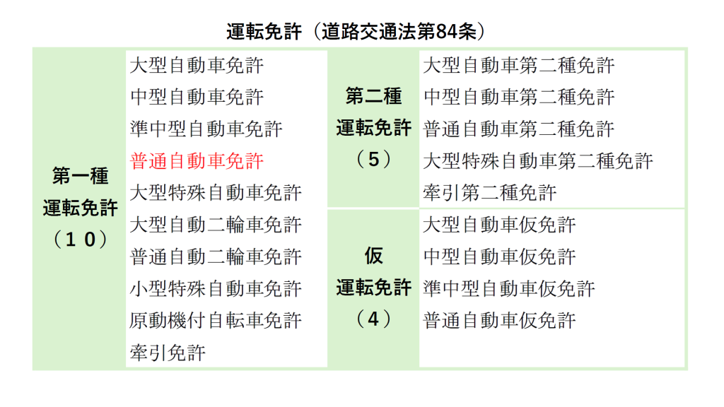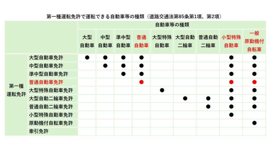 普通自動車運転免許があれば、普通自動車の他に、小型特殊自動車と一般原動機付自転車も運転することができる。