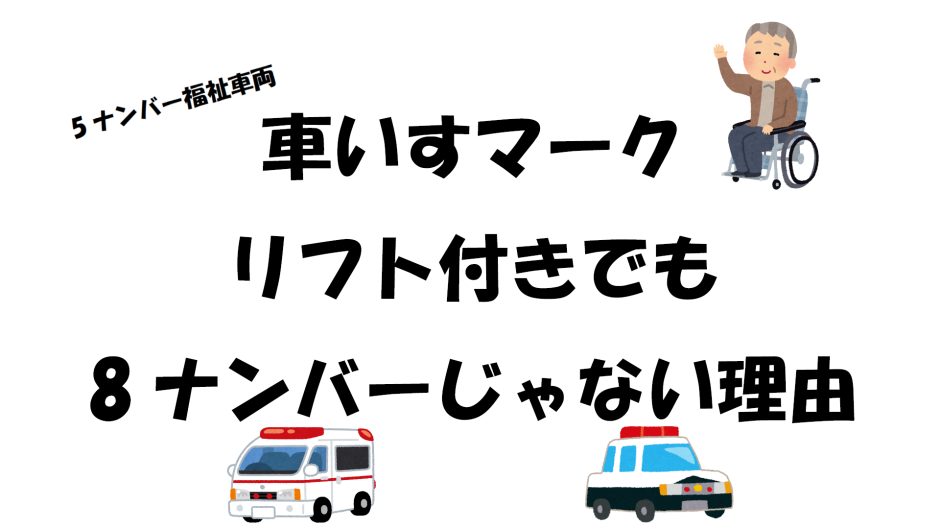 また、車いす利用者向けのリフト付き福祉車両であっても、構造上の要件を満たさなければ、8ナンバー(特種用途自動車)には分類されず、5ナンバーとか3ナンバーのままとなる。