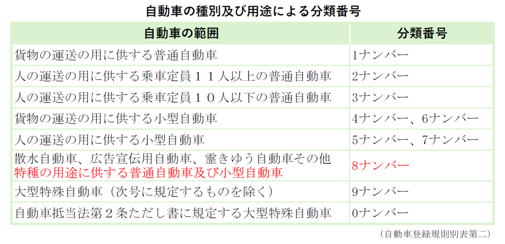 8ナンバーは「特殊の用途に供する自動車」なので特種用途自動車と呼ばれたりする。