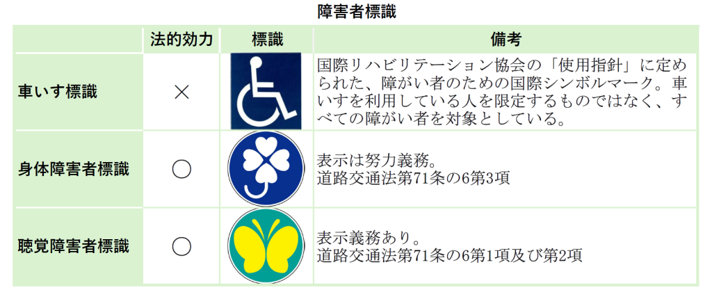 似たようなマークの中でも、「身体障害者標識」や「聴覚障害者標識」には法的な効力がある。