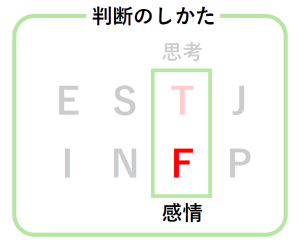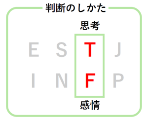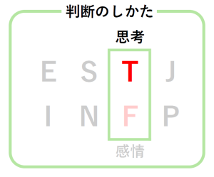 これは意思決定の方法の好みを示すもので、思考型(Thinking)のTと、感情型(Feeling)のFがある。